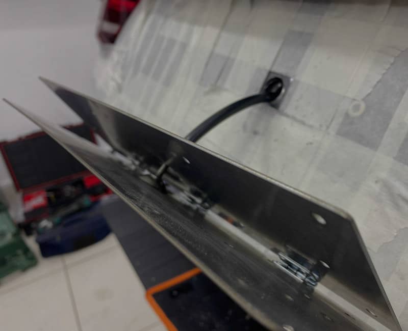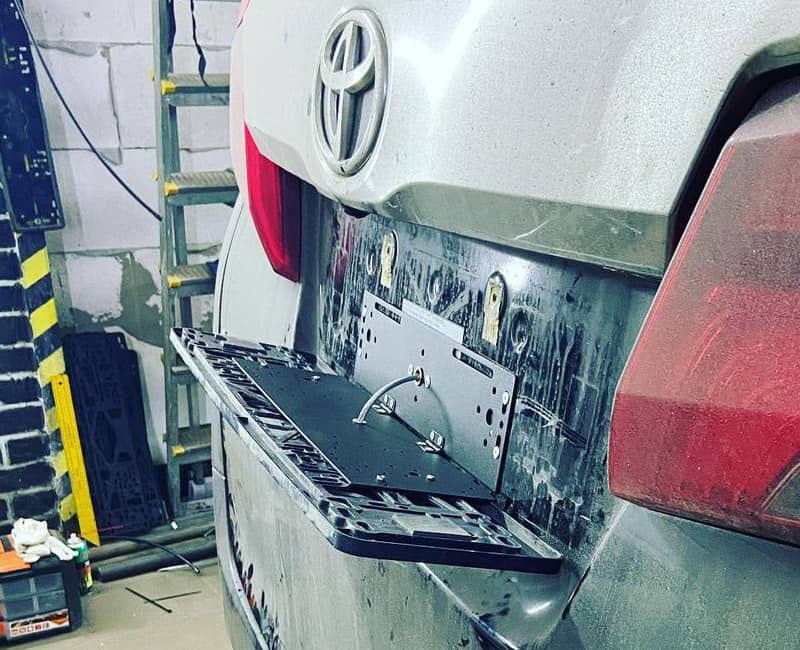 С помощью пульта дистанционного управления или кнопки в салоне откидная рамка с номером мгновенно откидывается на 90 градусов вниз.